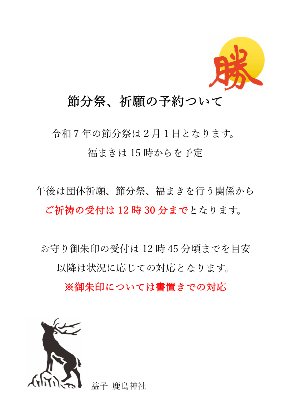 年末年始の御朱印対応、郵送対応についてのお知らせ